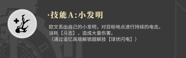 欧文的技能一是小发明,能够在指定地点释放持续性的电击,若加上斗志效果,伤害将更为可观。若解锁为超解技,则可变为球状闪电,带来更强的电系输出。技能二论证壁垒则能为他提供护盾,抵御伤害,但需注意耐力不足时护盾会破裂,需谨慎使用。