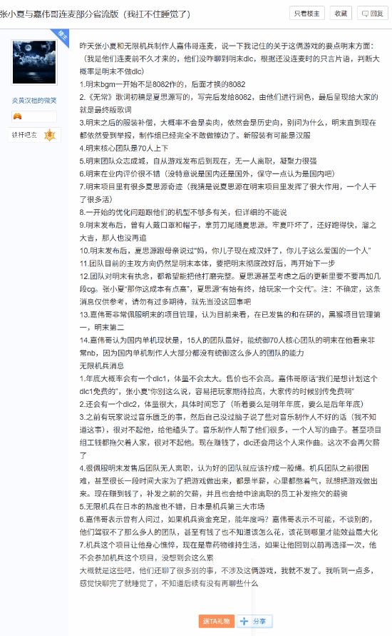 近期,《明末:渊虚之羽》在玩家中获得了相当不错的评价。贴吧用户“炎黄汉祖的微笑”分享了与知名游戏UP主@中年玩家张小夏的连麦内容,讨论了该游戏的幕后故事和未来计划。以下是一些精彩的要点: